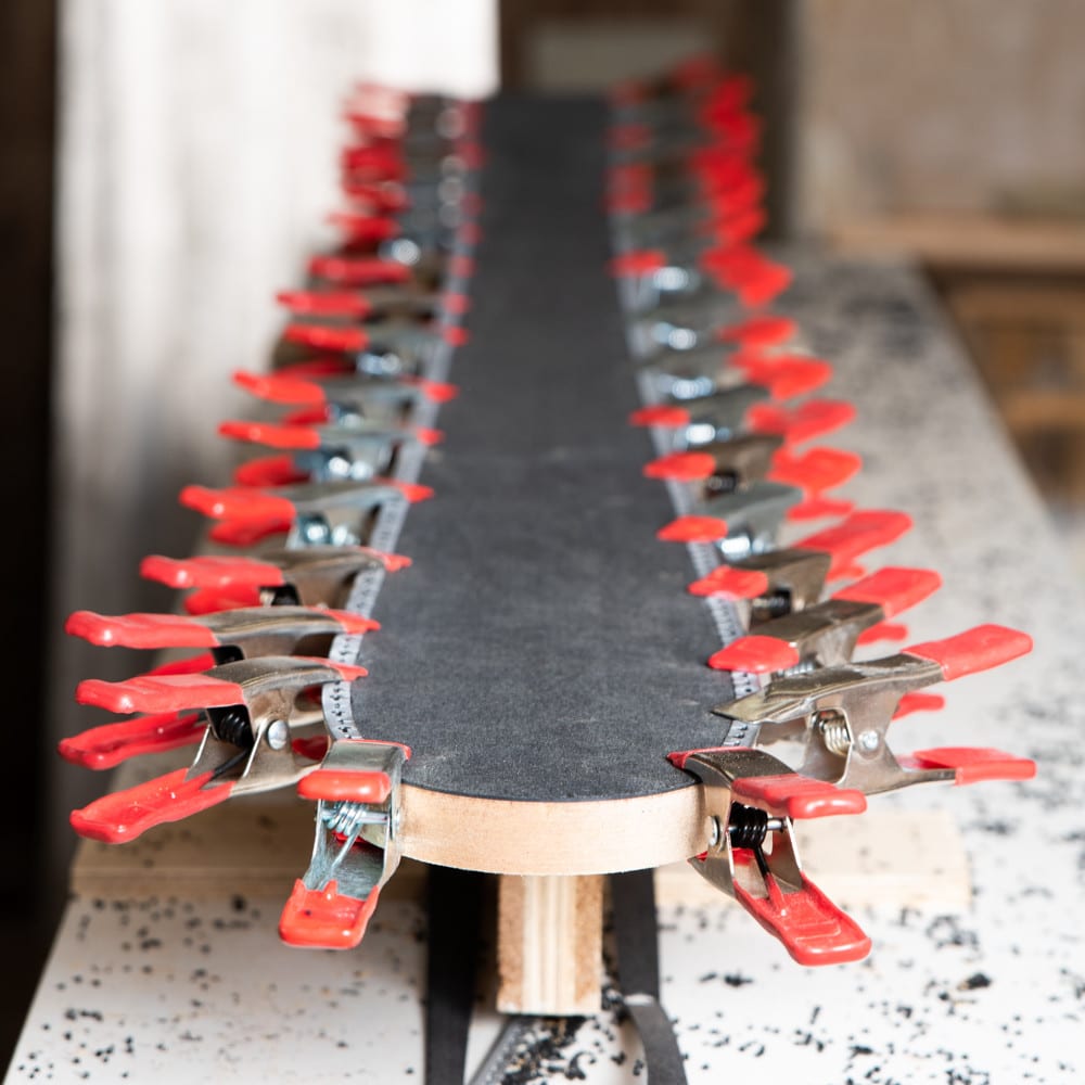 Vos skis en bois made in France par M&ski se mettent en forme lors de l’étape de pressage.